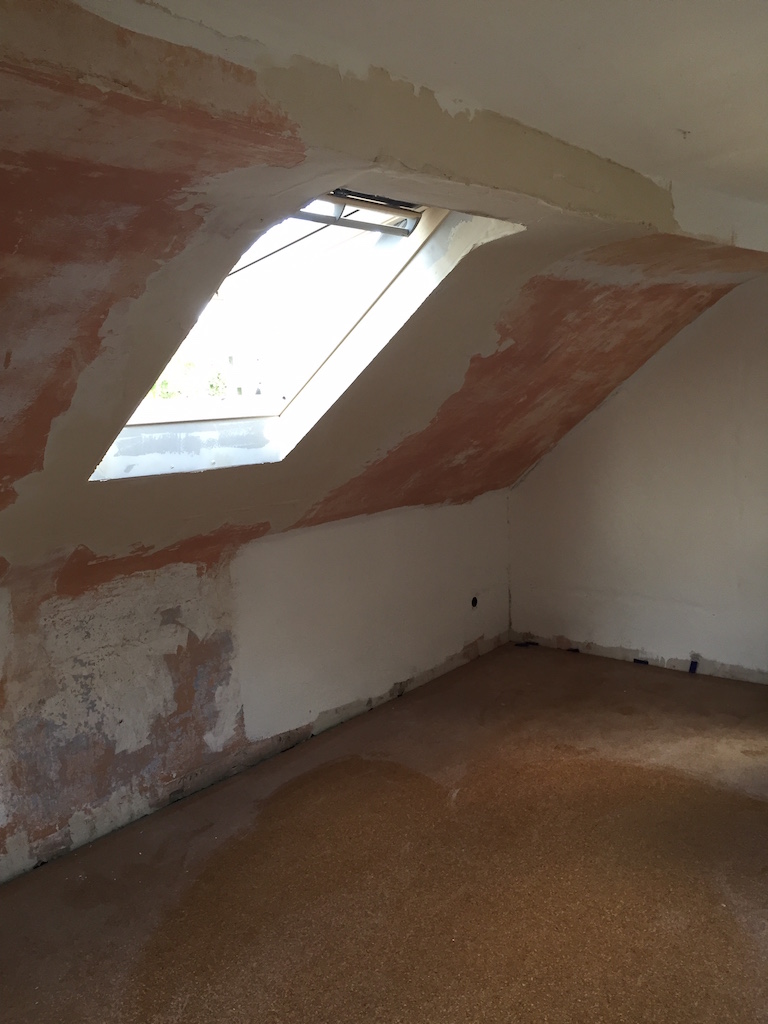 Da die alten Böden im 2. OG nicht mehr zu gebrauchen waren, musste etwas neues her. Und der neue Boden steht dem alten um nichts nach! Außerdem sind die Dachfenster verputzt und gestrichen. Kinderzimmer und Schlafzimmer: Check!