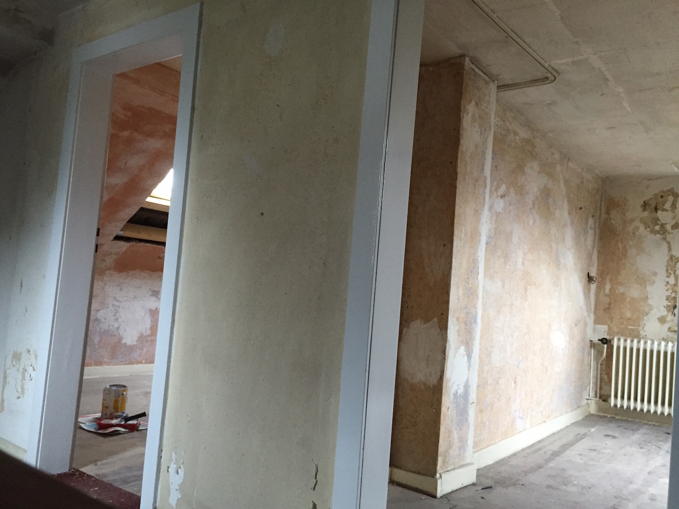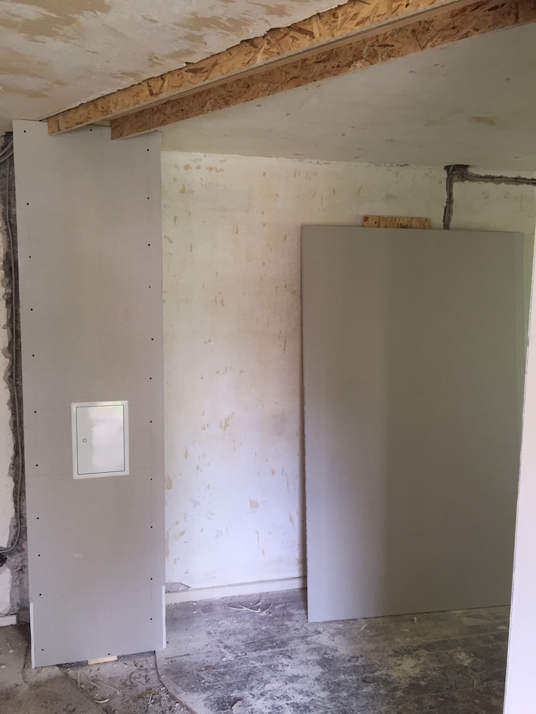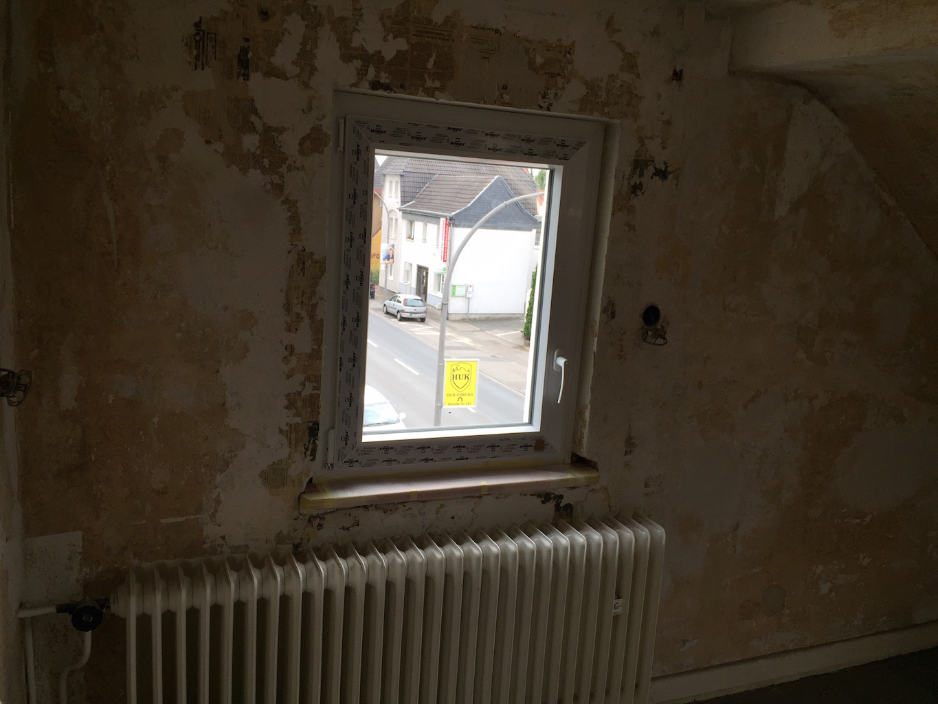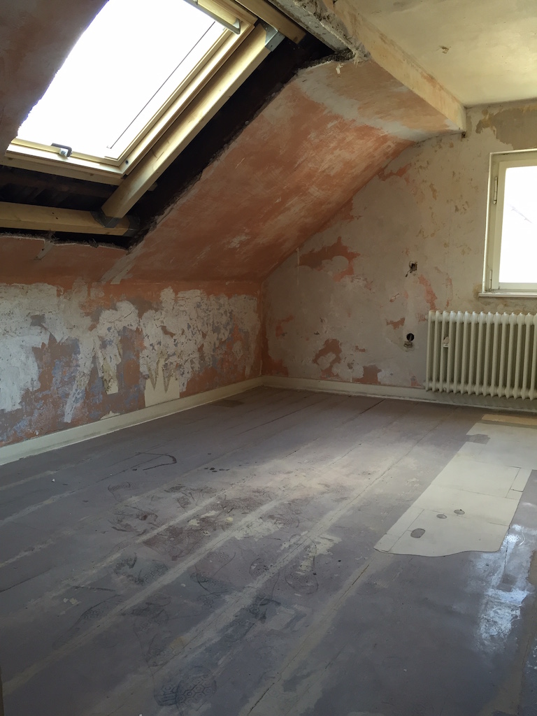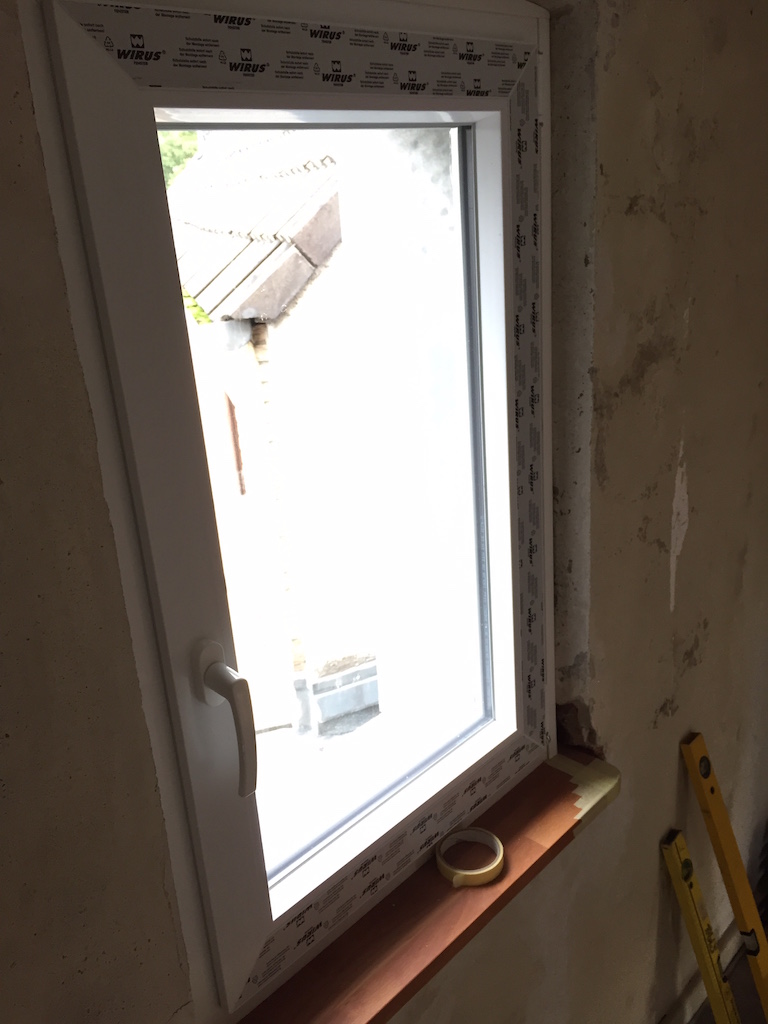 Heute wurden viele Baustellen weitergeführt, nachbearbeitet, beendet. Das zweite Dachfenster wurde eingebaut, die Durchgänge im Wohnbereich verputzt, sowie die Treppe im Flur vom Teppich befreit.