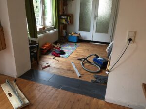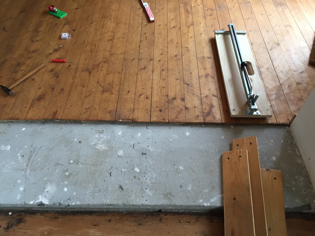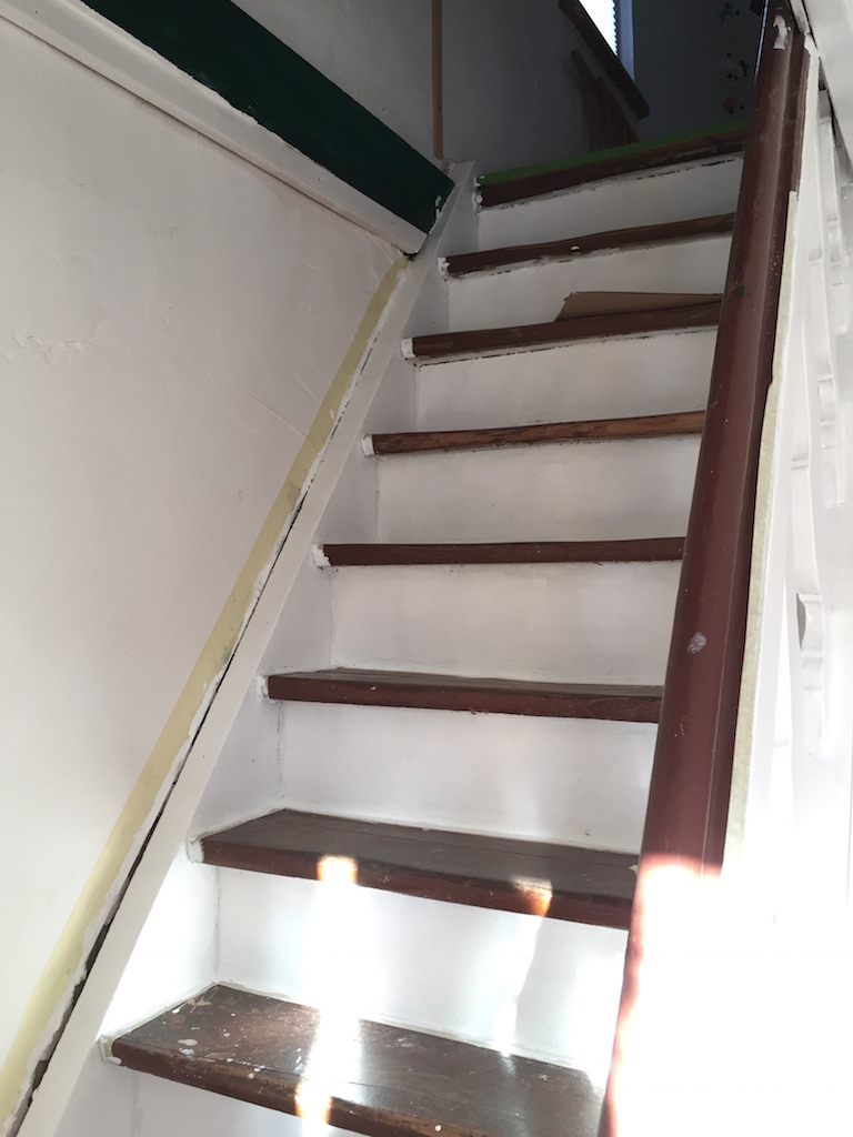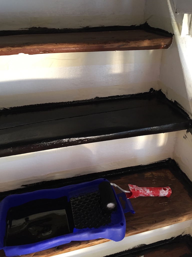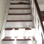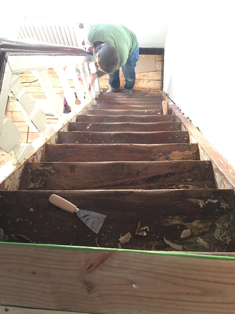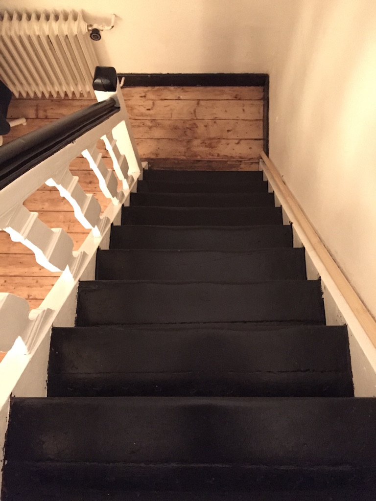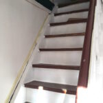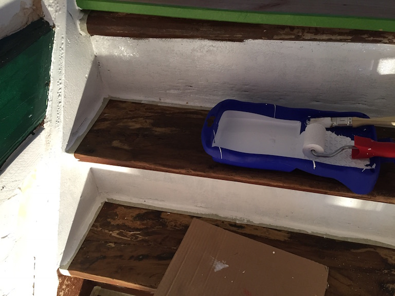 Bevor der Sommer gänzlich zur neige geht, nehmen wir uns nochmal den bereits vorgeschliffenen Aufgang vor: „Unschleifbare“ Ecken ausbessern, streichen, schleifen, ölen, leisten.
